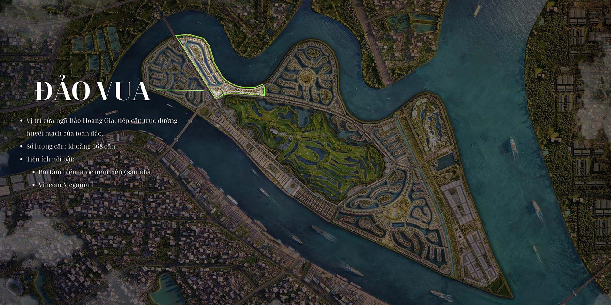 Hoàng Thành tiếp giáp trục đường Hạnh Phúc và sông Cấm, sông sinh thái, mang đến không gian trong lành, lý tưởng cho an cư. Phân khu gần các tiện ích đỉnh cao: trung tâm hội nghị Royal Palace, bến du thuyền, công viên VinWonders, học viện cưỡi ngựa hoàng gia và 3 công viên Nhật Bản (Zen Park, Ikigai Park, Youth Garden).