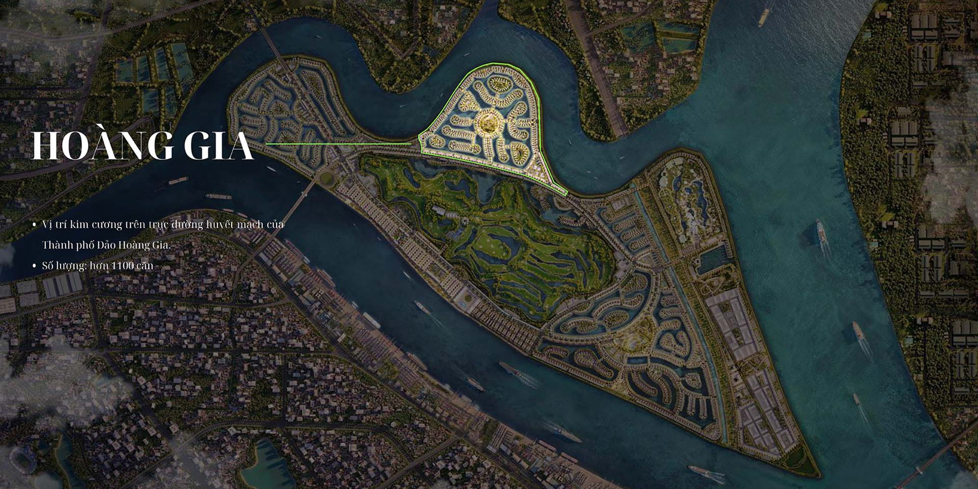 Hoàng Gia là phân khu đóng có quy mô lớn nhất và đẳng cấp bậc nhất dự án; nổi bật với cầu riêng và cổng chào cỗ xe bát mã dát vàng cao 10m, rộng 35m, chào đón giới siêu giàu.
