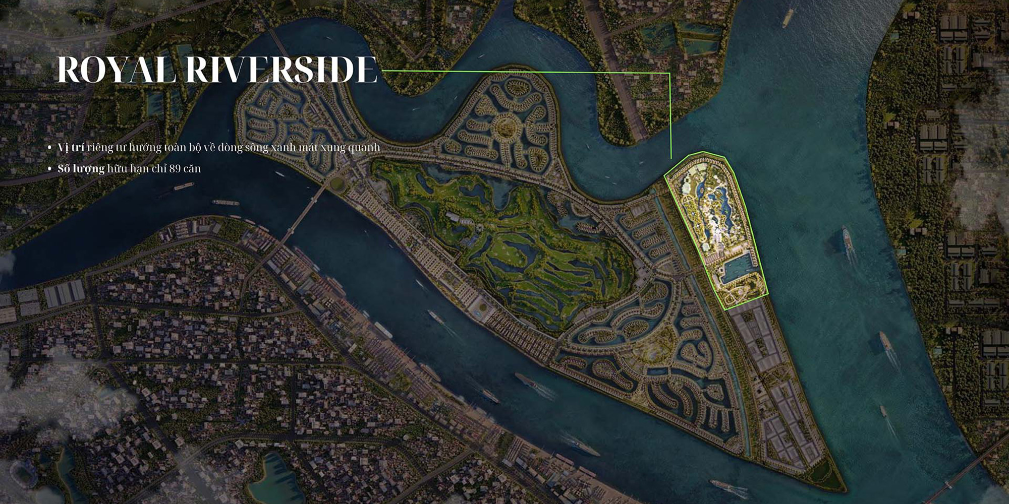 Thay vì bãi tắm biển mặn, mỗi biệt thự hướng công viên nhiệt đới và sông Bạch Đằng, với đường dạo bộ ngập hoa, chòi nghỉ ven sông, tạo không gian thư giãn độc đáo. So sánh với dinh thự The Rivus Elie Saab, Royal Riverside hướng tới giới siêu giàu với giá bán gần trăm tỷ/căn, là “89 viên kim cương” dành cho những chủ nhân xuất sắc, khẳng định đỉnh cao sống VIP tại Việt Nam.