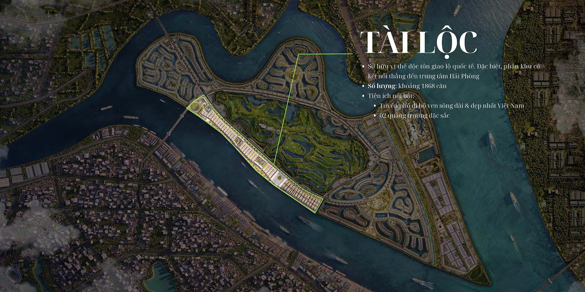 Sở hữu vị trí độc tôn tại Giao lộ Quốc tế, Tài Lộc một mặt giáp Vincom Mega Mall, Vinpearl Golf và trục đường Hạnh Phúc, mặt còn lại trải dài bên Phố đi bộ ven sông đẹp nhất Việt Nam.